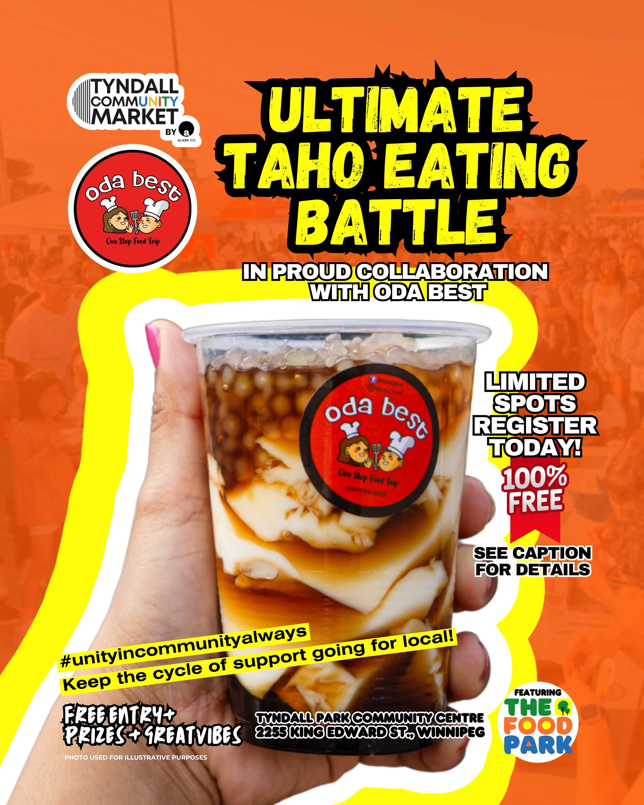 REMINDER: INDIVIDUALS PARTICIPATING IN THIS EATING CHALLENGE WILL BE RANDOMLY CHOSEN. ONLY THOSE SELECTED WILL RECEIVE A CONFIRMATION EMAIL FROM TYNDALLCOMMUNITYMARKET@GMAIL.COM OR TEXT MESSAGE. WE WILL NEVER ASK YOU FOR YOUR FINANCIAL INFORMATION, PLEASE BEWARE OF SCAMMERS. PARTICIPATION IN THIS EATING CHALLENGE IS FREE OF CHARGE.